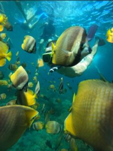 ☆ Manta Point – a spot in a rocky bay in southwest of the island . People come here to swim with manta rays , good – natured giants with a fin span of up to five meters : Reef crabs , Turtlles, and Sunfish also live here.